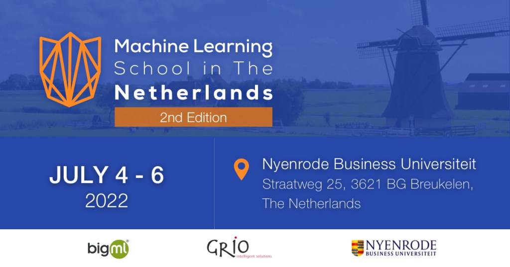 Without further ado, BigML, Grio, and Nyenrode Business Universiteit are pleased to invite you to the second Machine Learning School in The Netherlands on July 4-6, 2022. The three-day event will take place at Nyenrode Business University, in Breukelen (near Amsterdam), and the program is designed to address the needs of different professional profiles.