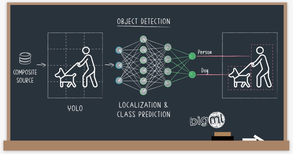 BigML’s Object Detection utilizes a specialized neural network known as YOLO (You Only Look Once) that pre-processes a given image in a single run by analyzing equally partitioned regions and assigning each region a match score per object class being predicted. If there are overlapping regions, those can be considered a match or not by applying user-defined thresholds. This approach has become very popular as it is proven to drastically speed up performance while not sacrificing much in the accuracy of the detections.