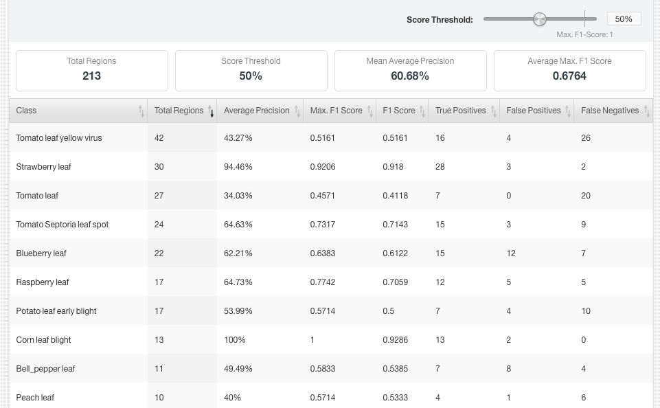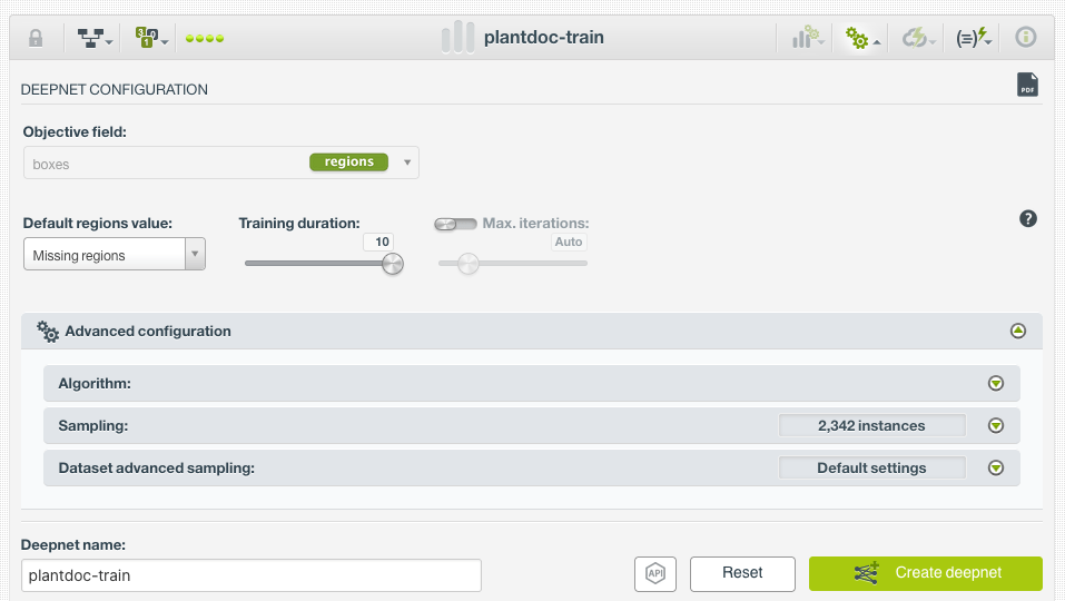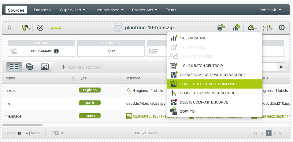 Building a dataset from scratch is not an easy task. I needed to find (and label) many examples of images for each kind of disease. Actually, before that, I did a bit of research to find common plant diseases. Fortunately, after some googling, I found PlantDoc, a public dataset for plant disease detection. This dataset already contains 2,598 images across 13 plant species and 27 classes (17-10, disease-healthy). It can be downloaded from Github, where the images are already split into train/test subgroups. Because the format of the regions was not exactly the one expected by BigML, I built a simple Python script to transform them. With that script, I generated two folders with train/test images and two JSON files with the regions for each subgroup. Then, I generated zip files and uploaded them to BigML, obtaining the following Table+Image composite source for the training data: