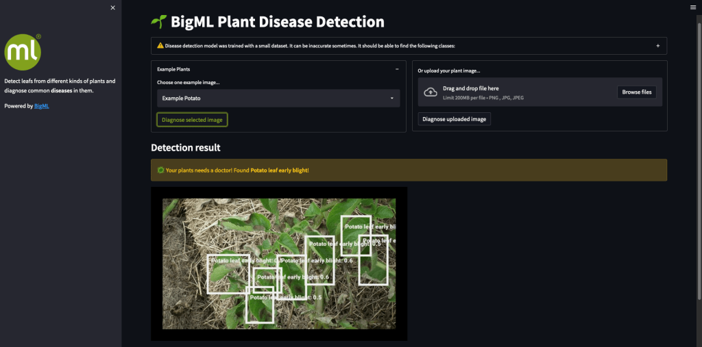 Because I was using Streamlit, deploying this web app was just a matter of giving it access to the repository and configuring the needed environment variables with the BigML authentication information. Just like that, my Plant Disease Detection application was ready to rock and roll!