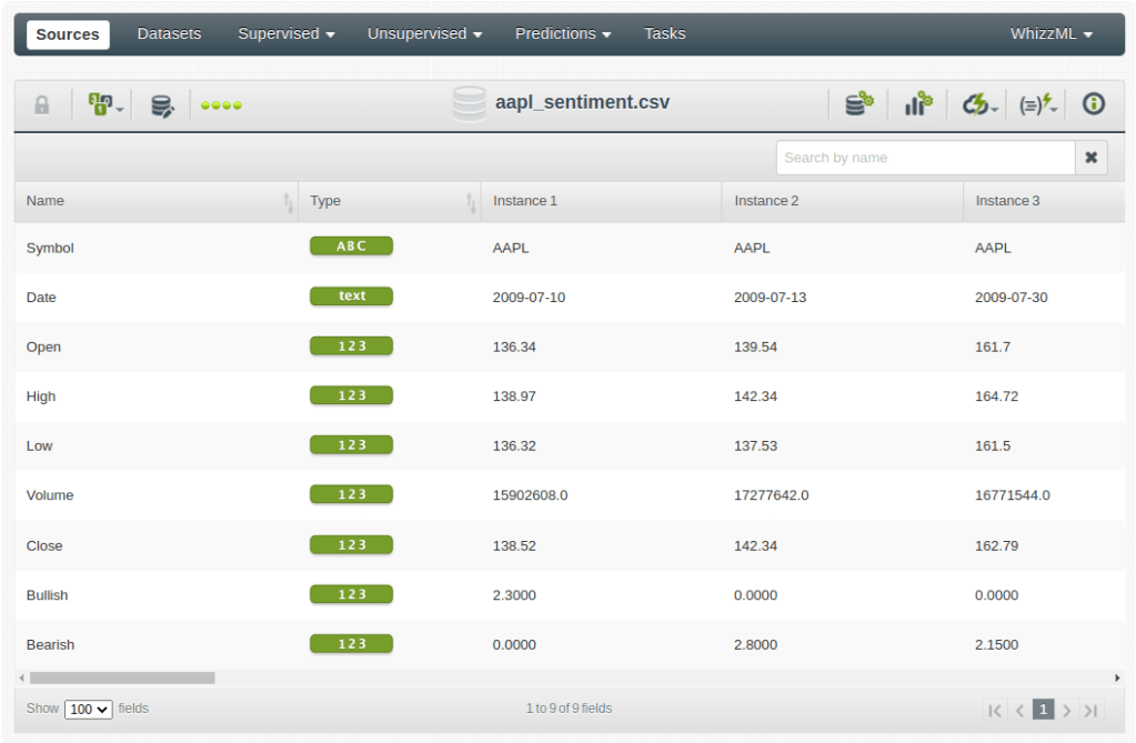It contains information about the daily stock trade prices and volumes, plus a couple of fields that store the sentiment associated with the stock during the day (i.e., Bullish/Optimist, Bearish/Pessimist). When uploaded to BigML, the resulting dataset is extended by some extracted features: the date-time field decomposition.