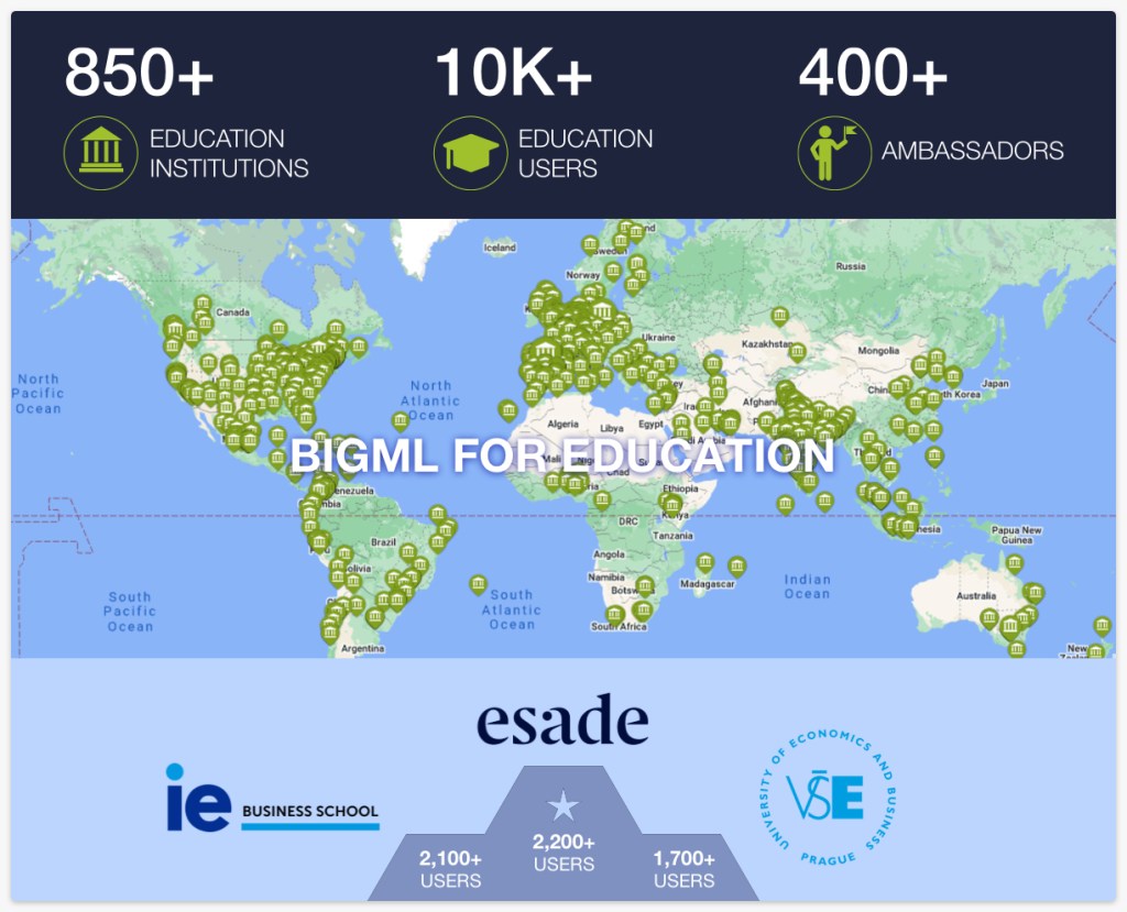 BigML’s Education program is one of the pillars of our company, as we take Machine Learning education and training very seriously because it leads to real-world Machine Learning adoption. We are thrilled to share that more than 10,000 education users have been using BigML for educational purposes. They come from more than 850 educational institutions, most of them universities, and more than 400 ML practitioners help actively spread the word as BigML ambassadors. Thank you all from the bottom of our hearts for helping us build a bigger and stronger BigML community around the world!