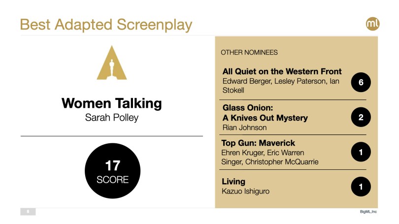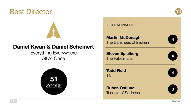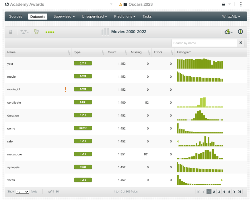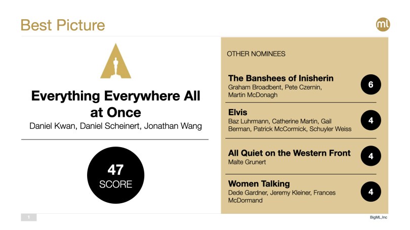 As we have done since 2018, the BigML team has been hard at work gathering the relevant data points about this year’s nominees and updating our Machine Learning models. Thankfully, this makes it possible for anyone out there to join the fray to make their own ML-powered predictions by simply cloning the Movies 2000-2022 public dataset from the BigML gallery and using it in conjunction with the wide variety of modeling resources of the BigML platform. Don’t have an account yet? Get a free one here in less than a minute!