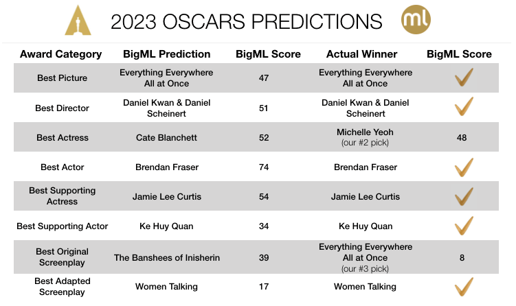 On the other hand, if done randomly, getting 12 out of 19 predictions right with anywhere between 5 to 10 nominees for each category is still equivalent to finding the one correct combination out of 244,140,625 possible combinations. While not perfect, our models do pick up many valuable signals pointing to eventual winners. The tables below summarize the prediction outcomes per category. Of the two major award category misses, we already knew the Best Actress Oscar would be a close call and it went to our second pick, Michelle Yeoh. However, Best Original Screenplay also going to Everything Everywhere All at Once was more of a remote outcome per the corresponding model.