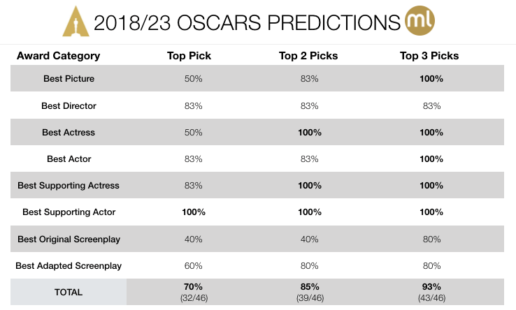 We’ve also updated the cumulative table below that compiles all our predictions between the 2018 and 2023 Oscars and the corresponding hit rates for the major categories. In addition to the Top Picks that we annually shared in our past blogs, this table lists how the accuracy metric improves if we also consider the movies that received the highest two (Top 2) or three (Top 3) scores. The Top Picks alone had an average 70% hit rate, whereas the coverage reaches 93% with the Top 3 taken into account.