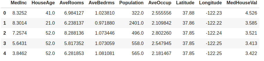We’ll start simple and do some pricing prediction using the California House Pricing file. It contains data about the medium price of houses in California and their features, like their age, the number of bedrooms or bathrooms, etc. In the notebook, the information is loaded in a Pandas DataFrame.